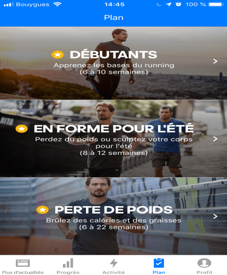 Sur ces captures d’écran nous voyons un premier aperçu des fonctionnalités basiques proposées par l’application. Il convient de noter que d’autres plus précises sont disponibles : évaluation de la fréquence cardiaque, dénivelé effectuée etc. Également la capture d’écran située à droite expose les différents programmes sportifs proposés par l’application.
