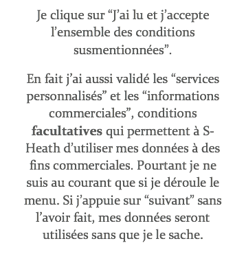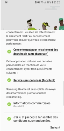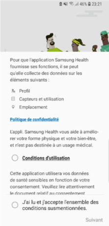 Pour mieux comprendre le fonctionnement de Samsung Health, j’ai d’abord réinitialisé l’application en la désactivant et la réactivant. Je n’avais d’ailleurs jamais remarqué qu’elle fonctionnait déjà et mesurait mes données, mes pas notamment, tous les jours. Pourquoi avoir suivi ce protocole ? Une question importante me taraudait… Mes données étaient-elles sécurisées ? N’étaient-elles réservées qu’à un usage privé ? Je n’en savais rien et si ces informations m’avaient échappées à la première utilisation, c’était probablement le cas pour la plupart des utilisateurs. Cette fois, il en serait autrement, je pourrais passer au crible l’entrée dans l’application et notamment le passage indispensable par l’acceptation des « Conditions d’utilisations », que personne ne connait.