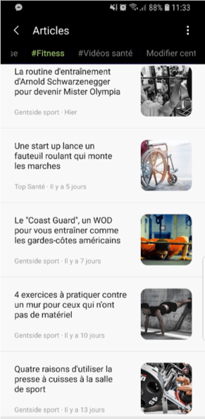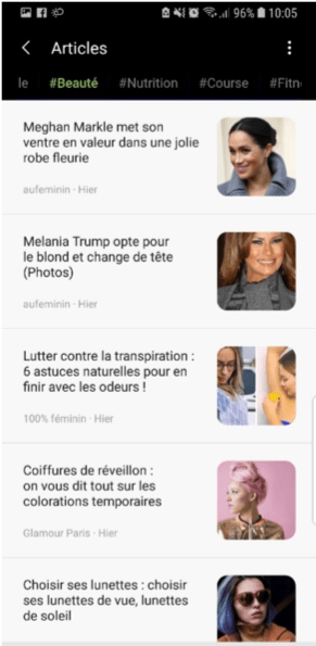 L’application fonctionne donc en interaction avec le monde social. Ce qui m’a frappé, c’est la manière donc elle retransmet certaines valeurs et certaines normes. Elles semblent reproduire par exemple une image très stéréotypée du genre. Cela est très visible dans l’onglet « découvrir » de l’application qui propose notamment de consulter des articles sur plusieurs thèmes comme la #Médecine, la #Beauté ou encore le #Fitness. Il est intéressant de regarder les articles proposés par catégories. On voit ici que le contenu est fortement divisé selon une norme de genre.