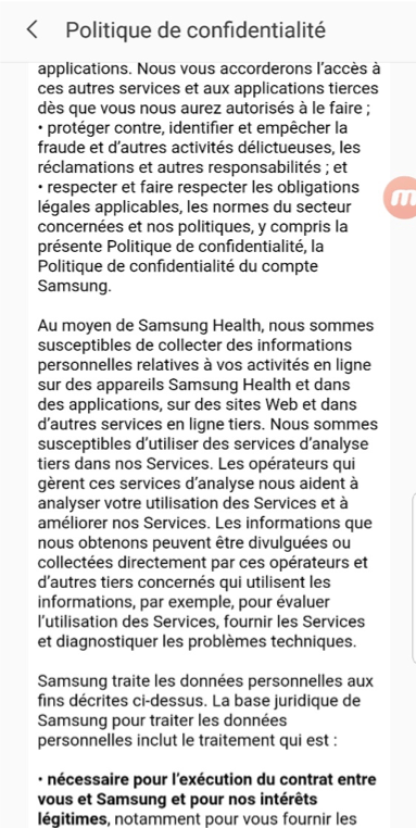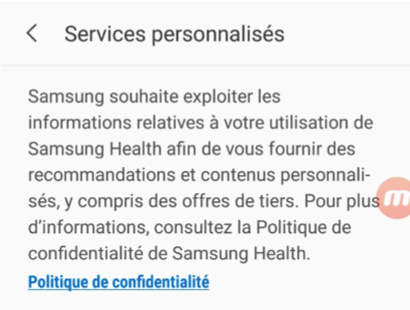 Samsung Health compte utiliser nos données pour « améliorer » le service. Qu’est-ce que cela signifie concrètement ? Des notifications et des mails remplis de conseils et d’objectifs mais aussi d’offres commerciales adaptés à notre utilisation de l’application. Si je fais beaucoup de courses, Samsung Health va me relancer sur des objectifs et défis de courses régulièrement mais aussi me proposer une montre connectée et des programmes de coureurs. L’application peut aussi collecter nos données à d’autres fins mais pour le savoir il va falloir une fois de plus fouiller plus en détails et lire les longues pages de la « Politique de confidentialité ». Si on lit l’encadré en rouge si dessus, on se rend compte que nos données peuvent être utilisées par d’autres services bien qu’on ne sache pas précisément de qui il s’agit. Finalement, ce que nous faisons sur notre téléphone est loin de rester sur notre téléphone. Nos données semblent aller un peu partout, naviguer de services en services pour permettre de nous fournir un service toujours plus personnalisé. Mais devenons-nous alors dépendant de l’application ? Comment s’immisce-t-elle dans notre quotidien ?